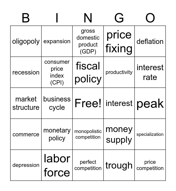This bingo card has a free space and 33 words: antitrust laws, bond, business cycle, collusion, commerce, consumer price index (CPI), deflation, depression, expansion, federal reserve system, fiscal policy, gross domestic product (GDP), inflation, inflation rate, interest, interest rate, labor force, market structure, monetary policy, money supply, monopolistic competition, monopoly, oligopoly, peak, perfect competition, price competition, price fixing, productivity, recession, specialization, stock market, trough and unemployment rate.