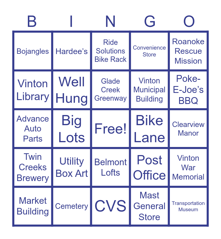 This bingo card has a free space and 44 words: Rosie’s Gaming Emporium, Transportation Museum, Roanoke Municipal Building, Market Building, Mural, Mast General Store, Ride Solutions Bike Rack, Railroad Tracks, Roanoke Rescue Mission, Cemetery, Convenience Store, Bike Lane, Belmont Lofts, Utility Box Art, Bank, CVS, Bigfoot Art, Advance Auto Parts, Bus Shelter, Poke-E-Joe’s BBQ, Hardee’s, Water Authority Building, Kroger, Bojangles, Lancerlot Sports Complex, Clearview Manor, Sculpture, Dunkin’ Donuts, Post Office, Twin Creeks Brewery, RND Coffee, Vinton War Memorial, Church, LOVE Sign, Big Lots, Fallon Park, Wal-Mart, Tinker Creek Greenway, Glade Creek Greenway, Vinton Library, Vinton Municipal Building, Roanoke City Public Schools, Well Hung and Playground.