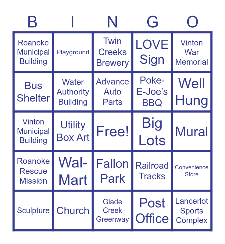 This bingo card has a free space and 44 words: Bojangles, Lancerlot Sports Complex, Clearview Manor, Sculpture, Dunkin’ Donuts, Post Office, Twin Creeks Brewery, RND Coffee, Vinton War Memorial, Church, LOVE Sign, Big Lots, Fallon Park, Wal-Mart, Tinker Creek Greenway, Glade Creek Greenway, Vinton Library, Vinton Municipal Building, Roanoke City Public Schools, Well Hung, Playground, Rosie’s Gaming Emporium, Transportation Museum, Roanoke Municipal Building, Market Building, Mural, Mast General Store, Ride Solutions Bike Rack, Railroad Tracks, Roanoke Rescue Mission, Cemetery, Convenience Store, Bike Lane, Belmont Lofts, Utility Box Art, Bank, CVS, Bigfoot Art, Advance Auto Parts, Bus Shelter, Poke-E-Joe’s BBQ, Hardee’s, Water Authority Building and Kroger.