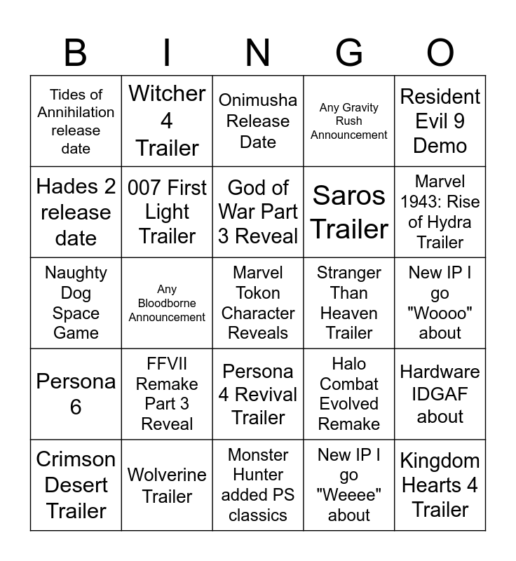 This bingo card has a free space and 24 words: FFVII Remake Part 3 Reveal, Wolverine Trailer, God of War Part 3 Reveal, Crimson Desert Trailer, Resident Evil 9 Demo, Tides of Annihilation release date, Hades 2 release date, Witcher 4 Trailer, Stranger Than Heaven Trailer, Persona 4 Revival Trailer, Saros Trailer, Naughty Dog Space Game, Halo Combat Evolved Remake, Hardware IDGAF about, 007 First Light Trailer, New IP I go "Weeee" about, New IP I go "Woooo" about, Onimusha Release Date, Marvel 1943: Rise of Hydra Trailer, Any Bloodborne Announcement, Kingdom Hearts 4 Trailer, Persona 6, Any Gravity Rush Announcement and Monster Hunter added PS classics.