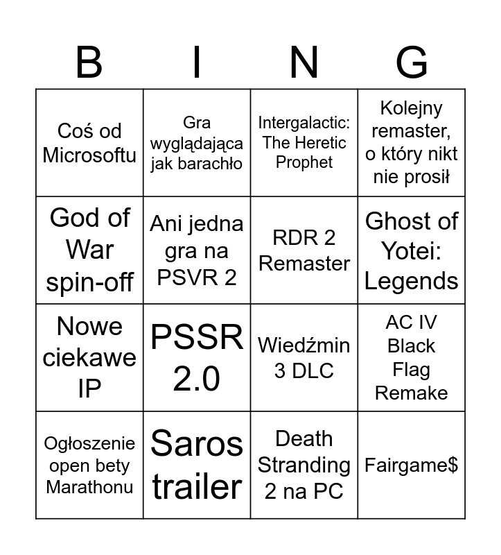 This bingo card has 16 words: Saros trailer, AC IV Black Flag Remake, Intergalactic: The Heretic Prophet, Coś od Microsoftu, Nowe ciekawe IP, Gra wyglądająca jak barachło, Wiedźmin 3 DLC, Death Stranding 2 na PC, God of War spin-off, Ani jedna gra na PSVR 2, Ogłoszenie open bety Marathonu, Kolejny remaster, o który nikt nie prosił, PSSR 2.0, Ghost of Yotei: Legends, RDR 2 Remaster and Fairgame$.