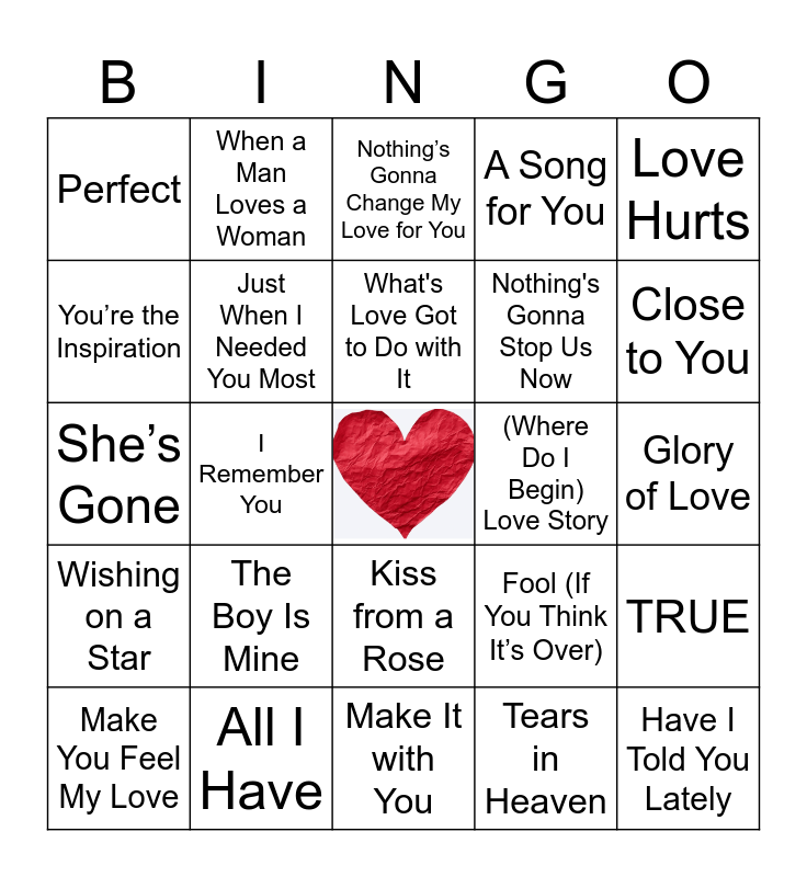 This bingo card has a free space and 68 words: Just the Way You Are, Have I Told You Lately, Killing Me Softly with His Song, When I Need You, Landslide, If You Don't Know Me by Now, When a Man Loves a Woman, I Want to Know What Love Is, What's Love Got to Do with It, You’re Beautiful, Kiss from a Rose, Unchained Melody, Glory of Love, Love Hurts, Lost in Your Eyes, You’re the Inspiration, I Remember You, Perfect, I’m Yours, The Boy Is Mine, Nothing's Gonna Stop Us Now, Fool (If You Think It’s Over), Wishing on a Star, A Thousand Years, Through the Fire, It Girl, Baby, I Love Your Way, I’ll Stand by You, TRUE, Stand by Me, Nothing’s Gonna Change My Love for You, Without You, Don’t Let Go (Love), I Keep Forgettin (Every Time You're Near), A Song for You, I Love You Always Forever, Drive, Make You Feel My Love, Close to You, She’s Gone, Show Me Heaven, Wind Beneath My Wings, Just When I Needed You Most, The Power of Love, I’d Really Love to See You Tonight, Is This Love, It Started with a Kiss, Let’s Stay Together, (Where Do I Begin) Love Story, All I Have, Easy, I Swear, Let’s Just Fall in Love Again, Make It with You, You’ve Got a Friend, We’re in This Love Together, Tears in Heaven, Tell Laura I Love Her, You Belong to Me, (You Make Me Feel Like) A Natural Woman, What a Wonderful World, I Can’t Make You Love Me, Can’t Take My Eyes off You, Can You Feel the Love Tonight, Get Closer, Missing You, Twisted and I’d Love You to Want Me.