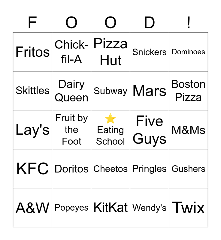 This bingo card has a free space and 34 words: McDonalds, Wendy's, Burger King, Taco Bell, KFC, Dairy Queen, Dominoes, A&W, Chick-fil-A, Tim Horton's, Subway, Pizza Hut, Little Caesars, Dunkin' Donuts, Five Guys, Boston Pizza, Popeyes, Lay's, Doritos, Pringles, Cheetos, Ruffle's, Fritos, M&Ms, KitKat, Twix, Snickers, Milky Way, Mars, Skittles, Airheads, Fruit by the Foot, Gushers and Breyers Ice Cream.