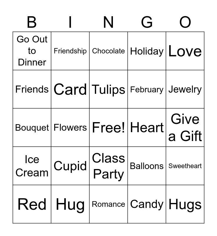 This bingo card has a free space and 29 words: Red, Pink, Flowers, Roses, Go Out to Dinner, Chocolate, Card, Cupid, Heart, Hug, Give a Gift, Hugs, Romance, Candy, Jewelry, Be Mine, Class Party, Ice Cream, Love, Bouquet, Balloons, Doves, February, Friends, Holiday, Friendship, Sweetheart, Tulips and St. Valentine.
