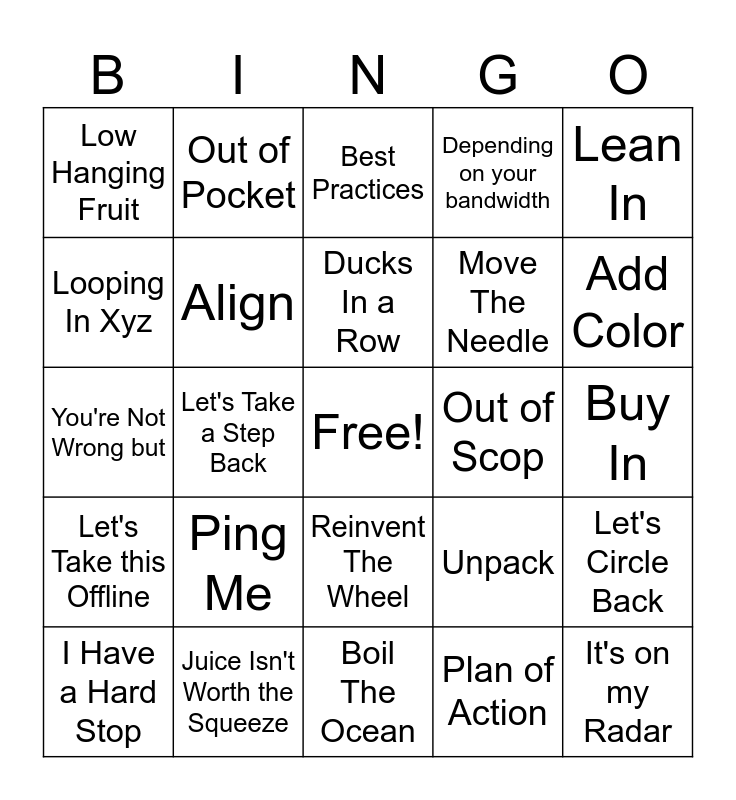 This bingo card has a free space and 28 words: Let's Circle Back, Let's Put a Pin In This, Move The Needle, Plan of Action, Looping In Xyz, Best Practices, Out of Pocket, Let's Take this Offline, Out of Scop, I Have a Hard Stop, You're Not Wrong but, Depending on your bandwidth, Juice Isn't Worth the Squeeze, Boil The Ocean, Add Color, In The Weeds, Ping Me, Align, Ducks In a Row, Reinvent The Wheel, Low Hanging Fruit, Scalable, It's on my Radar, Let's Take a Step Back, Buy In, Unpack, Lean In and Holistic.