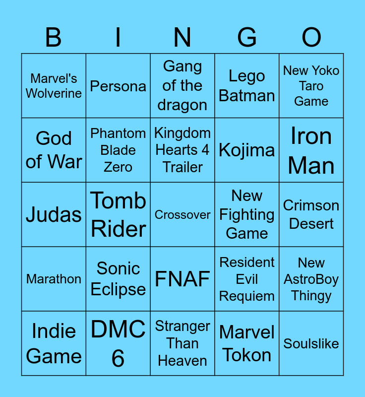 This bingo card has a free space and 24 words: Sonic Eclipse, DMC 6, Kingdom Hearts 4 Trailer, Indie Game, New Yoko Taro Game, Marvel's Wolverine, God of War, Persona, New Fighting Game, FNAF, Kojima, Judas, Resident Evil Requiem, New AstroBoy Thingy, Phantom Blade Zero, Marvel Tokon, Crimson Desert, Gang of the dragon, Iron Man, Tomb Rider, Soulslike, Marathon, Lego Batman and Stranger Than Heaven.