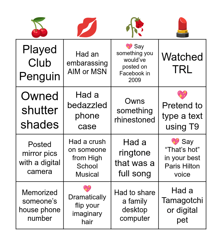 This bingo card has 71 words: Free!, Had an embarassing AIM or MSN, Downloaded a virus, Owned an iPod Nano or Shuffle, Burned a CD, Owned at least one pair of low-rise jeans, Watched TRL, Had a Facebook album titled “Randoms”, Posted mirror pics with a digital camera, Had (or desperately wanted) a BlackBerry, Had a scene or emo phase, Wore Silly Bandz, Had a crush on someone from High School Musical, Played Club Penguin, Used glitter body spray or overused Axe, Had a ringtone that was a full song, Still knows the choreography to a 2000s music video, Owned shutter shades, Wore Abercrombie unironically, Had to share a family desktop computer, Used T9 texting, Memorized someone’s house phone number, Was told leggings weren’t pants, Had a YouTube favorites playlist, Still has an old Facebook they can’t delete, Owned a pair of platform sandals, Had a flip phone, Had a pink or bedazzled flip phone, Wore butterfly clips regularly, Owned (or desperately wanted) a Juicy Couture tracksuit, Still knows the lyrics to a 2000s pop song, Had a Myspace page, Loves glossy lips over matte, Has worn blue eyeshadow, Had a Bratz doll growing up, Still says “That’s hot”, Owned something velour, Had chunky highlights, Had a bedazzled phone case, Loves hoop earrings or owned a chain, Can do the best runway walk, Owned cargo pants or Jorts, Had a Tamagotchi or digital pet, Loves cheetah print, Would survive as a 2000s pop star/celebrity, Always overdresses in the best way, Loves drama, Owns something rhinestoned, Would be voted Most Glam, Would bring back Myspace if they could, Secretly wants a Juicy tracksuit again, 💖 Do your best Bratz smize, 💖 Dramatically flip your imaginary hair, 💖 Pose like you’re on the cover of a 2004 teen magazine, 💖 Give your best red carpet interview answer, 💖 Blow a kiss like it’s 2006, 💖 Pretend to type a text using T9, 💖 Answer an imaginary flip phone dramatically, 💖 Do the “You’ve Got Mail!” voice, 💖 Sing one line from a 2000s song, 💖 Do 5 seconds of a 2000s music video dance, 💖 Recreate the “Single Ladies” hand move, 💖 Say “That’s hot” in your best Paris Hilton voice, 💖 Say “Gossip Girl here…” dramatically, 💖 Do your best duck-face selfie pose, 💖 Pretend to spray glitter body spray, 💖 Say something you would’ve posted on Facebook in 2009, 💖 Dramatically slam an imaginary Razr shut, 💖 Do a fake cry like you’re in a reality show confessional, 💖 Yell “You’re so fake!” like you’re on MTV and 💖 Recreate a dramatic breakup scene.