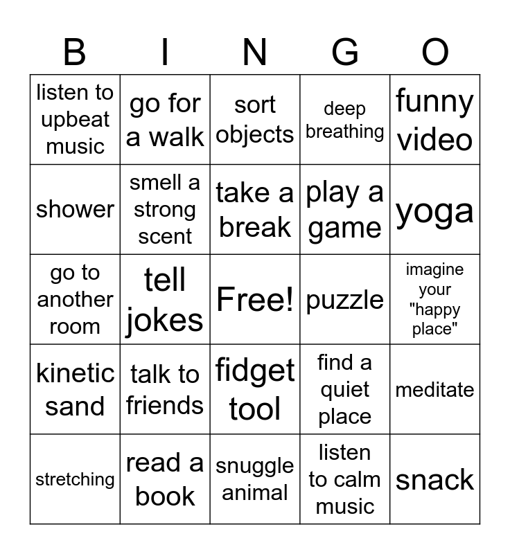 This bingo card has a free space and 49 words: drink water, snack, hugs, snuggle animal, talk to friends, sour candy, go for a walk, short nap, shower, wash your face, smell a strong scent, deep breathing, meditate, find a quiet place, count to ten, close your eyes for 30 seconds, take a break, puzzle, word search, funny video, tell jokes, listen to calm music, listen to upbeat music, play a game, jumping jacks, yoga, stretching, hold ice, fidget tool, kinetic sand, write a story, journal, talk with a therapist, spend time outside, read a book, listen to a book/podcast, positive affirmation, drawing or coloring, imagine your "happy place", make a list, look at pictures, clean, craft, learn a new skill, go to another room, sort objects, squeeze your hands, do something kind for someone and 5 4 3 2 1.