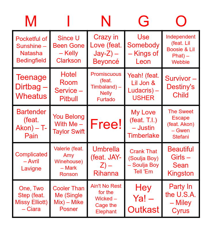 This bingo card has a free space and 28 words: Beautiful Girls – Sean Kingston, Unwritten – Natasha Bedingfield, Yeah! (feat. Lil Jon & Ludacris) – USHER, Hey Ya! – Outkast, Teenage Dirtbag – Wheatus, Crazy in Love (feat. Jay-Z) – Beyoncé, Since U Been Gone – Kelly Clarkson, Complicated – Avril Lavigne, My Love (feat. T.I.) – Justin Timberlake, One, Two Step (feat. Missy Elliott) – Ciara, Bartender (feat. Akon) – T-Pain, Use Somebody – Kings of Leon, Cooler Than Me (Single Mix) – Mike Posner, Ain't No Rest for the Wicked – Cage the Elephant, Survivor – Destiny's Child, Life We Live (feat. Namond Lumpkin & Slim Thug) – Project Pat, Valerie (feat. Amy Winehouse) – Mark Ronson, Hotel Room Service – Pitbull, Promiscuous (feat. Timbaland) – Nelly Furtado, Umbrella (feat. JAY-Z) – Rihanna, Pocketful of Sunshine – Natasha Bedingfield, Fallin' – Alicia Keys, Party In the U.S.A. – Miley Cyrus, You Belong With Me – Taylor Swift, The Sweet Escape (feat. Akon) – Gwen Stefani, Crank That (Soulja Boy) – Soulja Boy Tell 'Em, Independent (feat. Lil Boosie & Lil Phat) – Webbie and Wipe Me Down (feat. Foxx, Boosie & Webbie) – Trill Family.