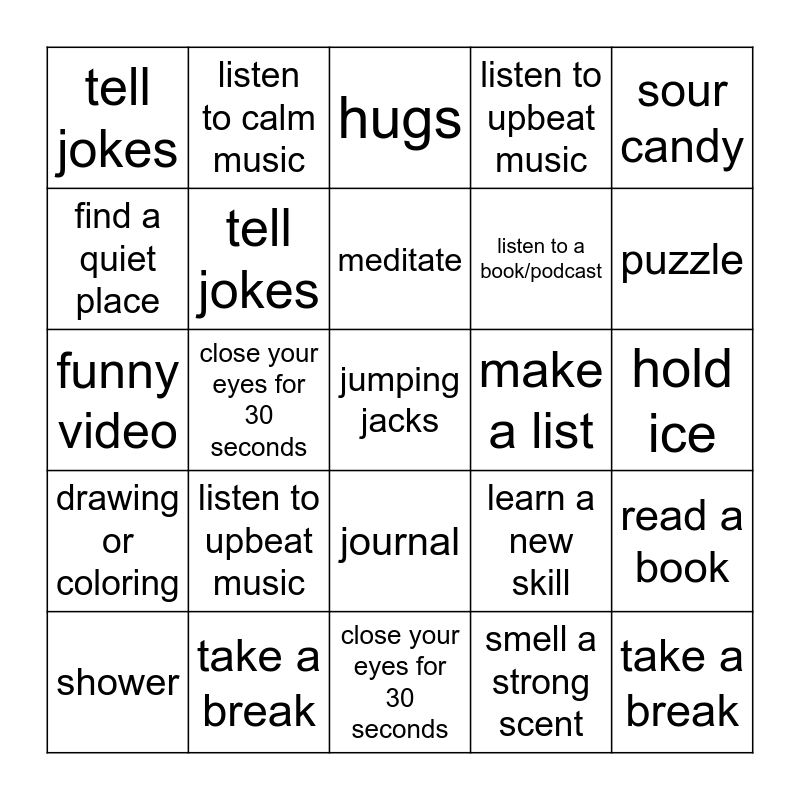 ⚠ This card has duplicate items: drink water (2), snack (2), hugs (2), snuggle animal (2), talk to friends (2), sour candy (2), go for a walk (2), short nap (2), shower (2), wash your face (2), smell a strong scent (2), deep breathing (2), meditate (2), find a quiet place (2), count to ten (2), close your eyes for 30 seconds (2), take a break (2), puzzle (2), word search (2), funny video (2), tell jokes (2), listen to calm music (2), listen to upbeat music (2), play a game (2), jumping jacks (2)