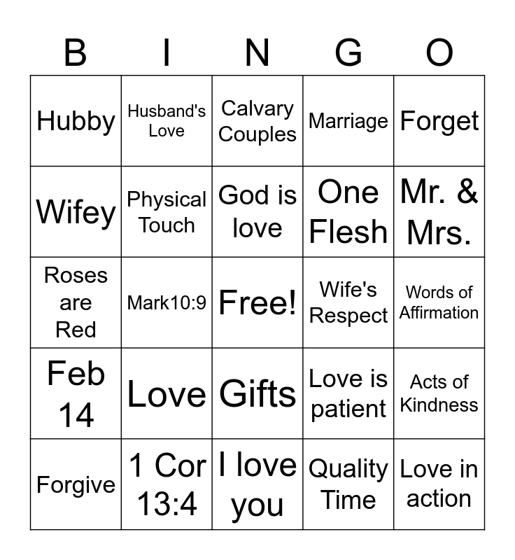 This bingo card has a free space and 24 words: Love, 1 Cor 13:4, God is love, Forgive, Forget, Hubby, Wifey, Husband's Love, Wife's Respect, Gifts, One Flesh, Roses are Red, Love is patient, Acts of Kindness, Physical Touch, Quality Time, Words of Affirmation, Calvary Couples, Mr. & Mrs., Mark10:9, Love in action, Feb 14, Marriage and I love you.