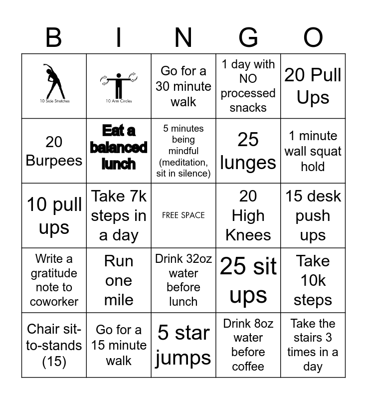 This bingo card has 2 images, a free space and 22 words: Run one mile, Go for a 15 minute walk, 5 minutes being mindful (meditation, sit in silence), Chair sit-to-stands (15), 20 Pull Ups, 20 Burpees, 20 High Knees, Drink 32oz water before lunch, 25 lunges, 10 pull ups, 25 sit ups, Take 10k steps, Eat a balanced lunch, Drink 8oz water before coffee, 15 desk push ups, Go for a 30 minute walk, 1 minute wall squat hold, Take 7k steps in a day, Take the stairs 3 times in a day, Write a gratitude note to coworker, 1 day with NO processed snacks and 5 star jumps.