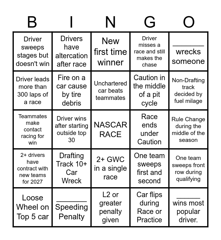 This bingo card has a free space and 24 words: Drafting Track 10+ Car Wreck, _______ Speeding Penalty, Unchartered car beats teammates, Loose Wheel on Top 5 car, _______ wrecks someone, Driver sweeps stages but doesn't win, Driver leads more than 300 laps of a race, Drivers have altercation after race, Race ends under Caution, 2+ GWC in a single race, Caution in the middle of a pit cycle, Teammates make contact racing for win, One team sweeps first and second, One team sweeps front row during qualifying, Fire on a car cause by tire debris, Car flips during Race or Practice, Rule Change during the middle of the season, New first time winner, Non-Drafting track decided by fuel milage, Driver wins after starting outside top 30, ______ wins most popular driver., 2+ drivers have contract with new teams for 2027, Driver misses a race and still makes the chase and L2 or greater penalty given.
