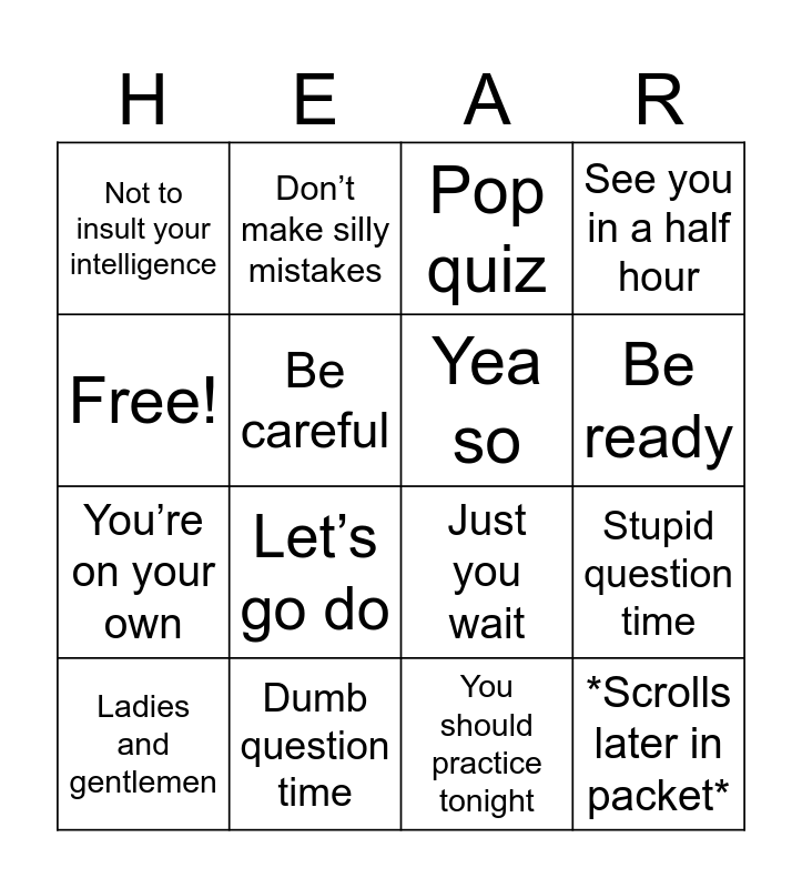 This bingo card has 16 words: Dumb question time, Stupid question time, Pop quiz, Not to insult your intelligence, You’re on your own, Don’t make silly mistakes, Just you wait, You should practice tonight, Free!, Be careful, Ladies and gentlemen, See you in a half hour, Let’s go do, Be ready, Yea so and *Scrolls later in packet*.