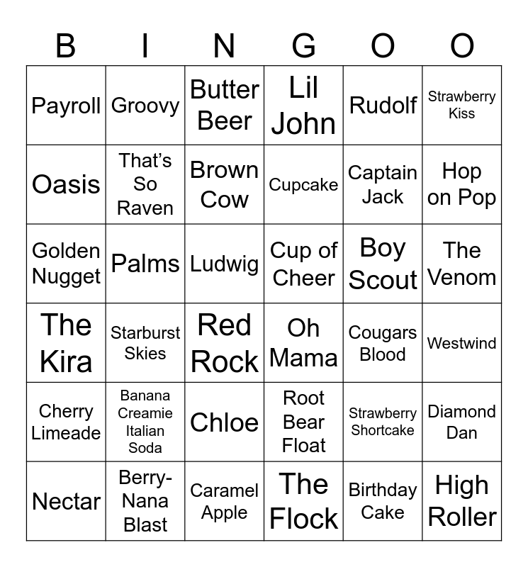 This bingo card has 83 words: A-List, The BLVD, Butter Beer, Coconut Cowboy, Dang Gina, Desert Delight, Dixie Sunset, Flamingo, High Roller, Italian Job, JoJo, Just Dew It, Oasis, Palms, Paradise, Payroll, Red Rock, Strawberry Kiss, Tidal Wave, Berry-Nana Blast, Birthday Cake, Brown Cow, Golden Nugget, Green Apple, Hop on Pop, Little Rebel, Almond Joy, Mahalo, Arnold Palmer, Beehive, Boy Scout, Blue Milk, Caramel Apple, Captain Jack, Cherry Limeade, Chloe, Cougars Blood, Cubby Bear, Cupcake, Cup of Cheer, Diamond Dan, The Flock, Fuego Jiego, Golden Knight, Governator, The Grinch, Groovy, Hawk Pop, Jedi, Just Peachy, The Kira, Lil John, Ludwig, Main Banana, Meldey, Misletoe, Nectar, Not So Mello Yellow, Oh Mama, The Papa, Pina Colada, POG, Red Milk (Kylo Ren), Rudolf, Shirely Temple, Starburst Skies, Strawberries N Cream, Strawberry Shortcake, Strawberry Colada, Sunshine & Daisy, Taco, Terryn It Up, Tootsie Pop, The Venom, Westwind, Chocolate Strawberries, Bananas Foster, That’s So Raven, Root Bear Float, Banana Creamie Italian Soda, Orange Creamsicle Italian Soda, Tripple Berry Cobbler a la mode and Peach Ring.