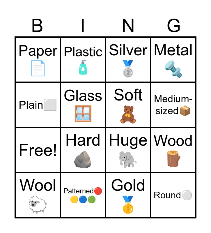 This bingo card has 22 words: Free!, Cotton🧵, Glass🪟, Gold🥇, Metal🔩, Paper📄, Plastic🧴, Silver🥈, Wood🪵, Wool🐑, Hard🪨, Soft🧸, Valuable💎, Square⬛, Heavy🏋️, Light🪶, Round⚪, Plain⬜, Patterned🔴🟡🔵🟢, Huge🐘, Medium-sized📦 and Tiny🐜.
