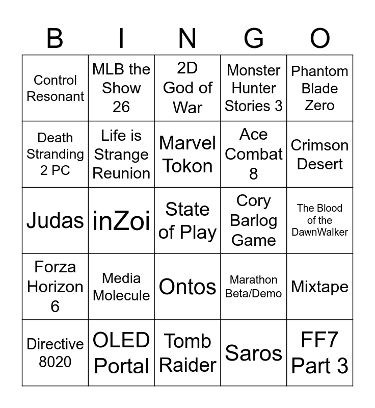 This bingo card has a free space and 24 words: Media Molecule, OLED Portal, Marvel Tokon, Directive 8020, Phantom Blade Zero, Control Resonant, Death Stranding 2 PC, MLB the Show 26, Cory Barlog Game, Ontos, Ace Combat 8, Judas, Marathon Beta/Demo, Mixtape, Life is Strange Reunion, Saros, The Blood of the DawnWalker, 2D God of War, Crimson Desert, inZoi, FF7 Part 3, Forza Horizon 6, Monster Hunter Stories 3 and Tomb Raider.