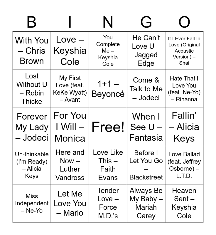 This bingo card has a free space and 38 words: Rock Steady – The Whispers, Computer Love – Zapp & Roger, If Only for One Night – Luther Vandross, My First Love (feat. KeKe Wyatt) – Avant, Love Ballad (feat. Jeffrey Osborne) – L.T.D., Here and Now – Luther Vandross, 1+1 – Beyoncé, I’ll Give All My Love to You – Keith Sweat, If I Ever Fall In Love (Original Acoustic Version) – Shai, Come & Talk to Me – Jodeci, For You I Will – Monica, He Can’t Love U – Jagged Edge, Heaven Sent – Keyshia Cole, Fallin’ – Alicia Keys, Lost Without U – Robin Thicke, Un-thinkable (I’m Ready) – Alicia Keys, Loveeeeeee Song (feat. Future) – Rihanna, You Complete Me – Keyshia Cole, Just a Friend 2002 – Mario, When I See U – Fantasia, With You – Chris Brown, Let Me Love You – Mario, Hate That I Love You (feat. Ne-Yo) – Rihanna, Miss Independent – Ne-Yo, Anniversary – Tony! Toni! Toné!, Tender Love – Force M.D.’s, Two Occasions – The Deele, Can’t Leave ’Em Alone (feat. 50 Cent) – Ciara, I Love Me Some Him – Toni Braxton, Love All Over Me – Monica, Why I Love You So Much – Monica, Love Like This – Faith Evans, Always Be My Baby – Mariah Carey, Love – Keyshia Cole, So Into You – Tamia, Before I Let You Go – Blackstreet, Forever My Lady – Jodeci and Body Party – Ciara.