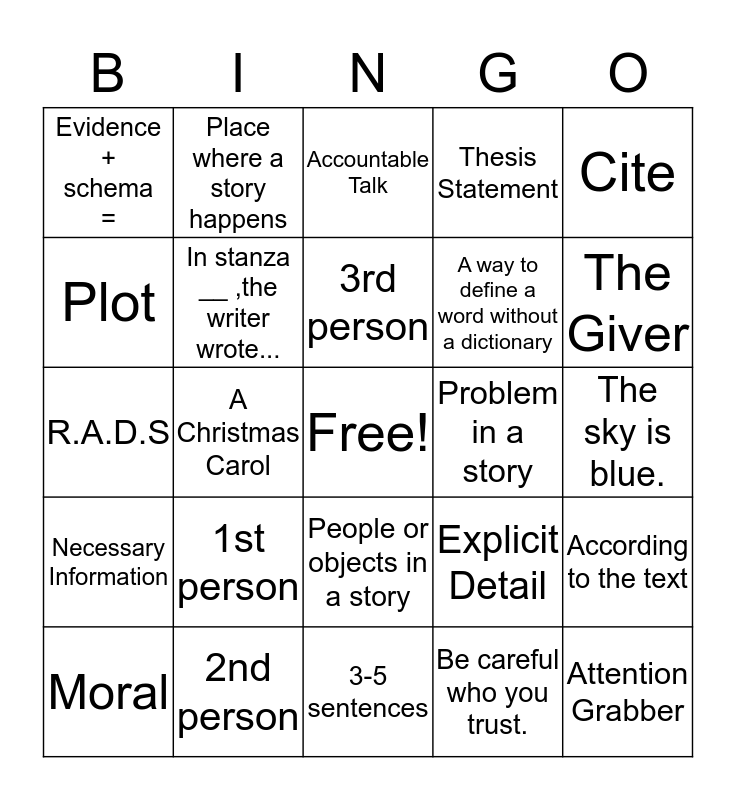 This bingo card has a free space and 24 words: 1st person, 2nd person, 3rd person, Moral, Cite, Evidence + schema =, Plot, Place where a story happens, Problem in a story, People or objects in a story, A way to define a word without a dictionary, R.A.D.S, Explicit Detail, According to the text, In stanza __ ,the writer wrote..., Be careful who you trust., The sky is blue., Accountable Talk, The Giver, A Christmas Carol, Attention Grabber, Necessary Information, Thesis Statement and 3-5 sentences.