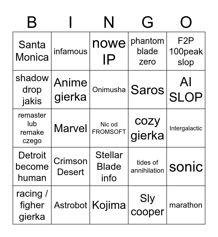 This bingo card has a free space and 24 words: racing / figher gierka, Crimson Desert, Onimusha, Sly cooper, F2P 100peak slop, Santa Monica, infamous, nowe IP, cozy gierka, Intergalactic, remaster lub remake czego, Anime gierka, tides of annihilation, sonic, shadow drop jakis, Astrobot, Kojima, phantom blade zero, AI SLOP, Detroit become human, Marvel, Stellar Blade info, Saros and marathon.