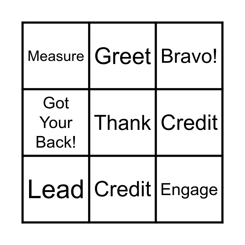 This bingo card has a free space and 8 words: Credit, Bravo!, Greet, Lead, Measure, Engage, Got Your Back! and Credit.