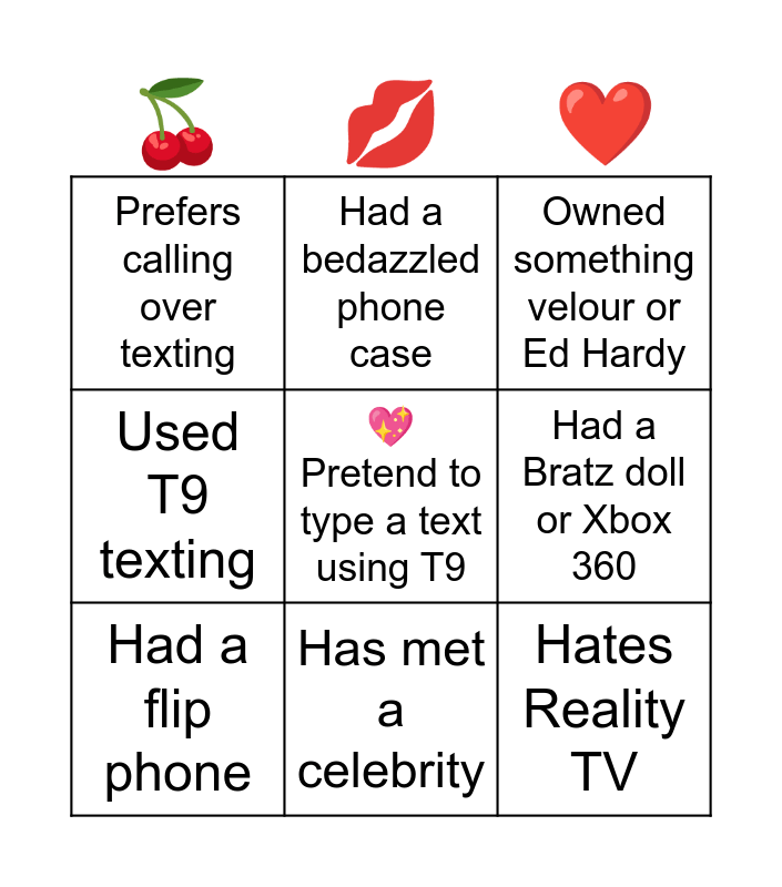This bingo card has 27 words: Free!, Loves Reality TV, Hates Reality TV, Still knows the lyrics to a 2000s pop song, Had a Bratz doll or Xbox 360, Owned something velour or Ed Hardy, Had a bedazzled phone case, Has a muted group chat, Will do karaoke tonight, Had to share a family desktop computer, Played Club Penguin, Used T9 texting, Has lived in more than 2 statesβ¨Is left handed, Would survive as a 2000s pop star/celebrity, Had a YouTube favorites playlist, Had an embarrassing username, Had a flip phone, Has met a celebrity, Has a go-to party trick, Prefers calling over texting, Has deleted social media before (voluntary or involuntary), π Do your best Bratz smize, π Dramatically flip your imaginary hair, π Blow a kiss like itβs 2006, π Share how they met the Birthday Girl, π Pretend to type a text using T9 and π Share how they met the Birthday Girl.