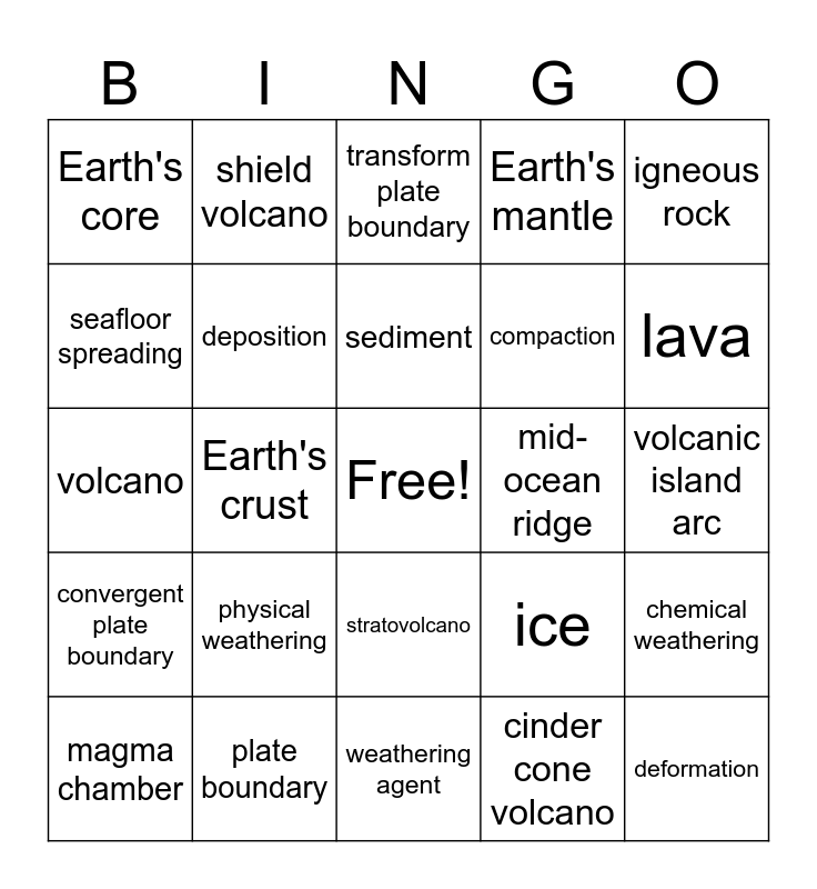 This bingo card has a free space and 38 words: metamorphic rock, weathering, erosion, deposition, chemical weathering, physical weathering, sediment, sedimentary rock, igneous rock, compaction, Earth's crust, Earth's mantle, deformation, volcanic island arc, seafloor spreading, convergent plate boundary, divergent plate boundary, transform plate boundary, rift valley, mid-ocean ridge, Earth's core, plate boundary, lava, magma chamber, melting, weathering agent, erosion agent, wind, gravity, mafic, felsic, stratovolcano, cinder cone volcano, shield volcano, freeze, ice, volcano and magma.