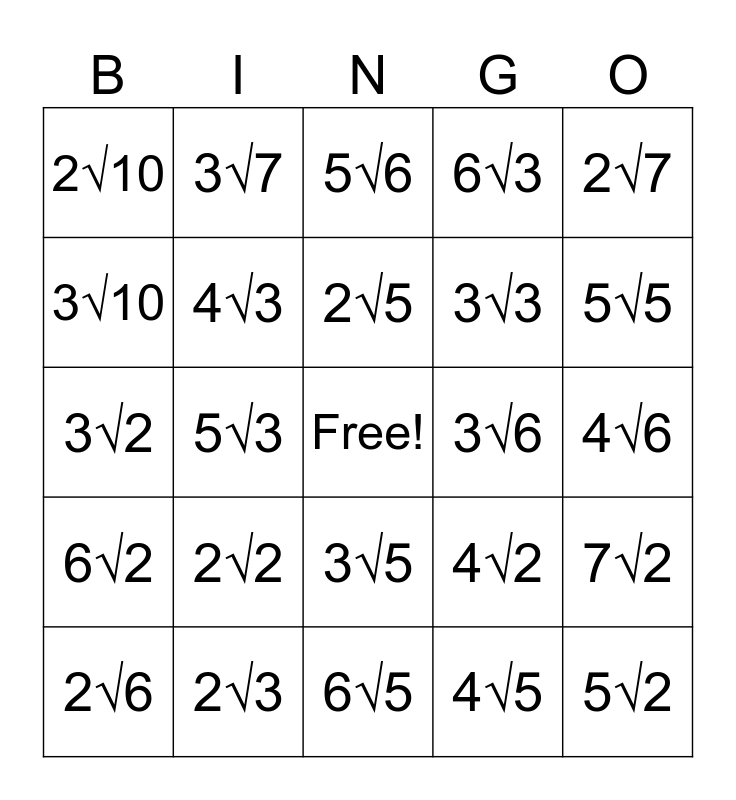 This bingo card has a free space and 24 words: 2√2, 2√3, 2√5, 2√6, 2√7, 2√10, 3√10, 3√7, 3√6, 3√5, 3√3, 3√2, 4√2, 7√2, 4√3, 4√5, 4√6, 5√6, 5√5, 5√3, 5√2, 6√2, 6√3 and 6√5.