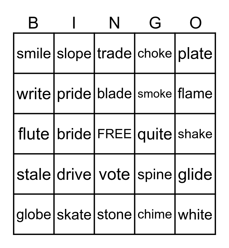 This bingo card has a free space and 24 words: drive, skate, blade, globe, plate, smile, write, slope, quite, vote, smoke, flute, spine, glide, pride, chime, shake, trade, flame, bride, white, stale, choke and stone.