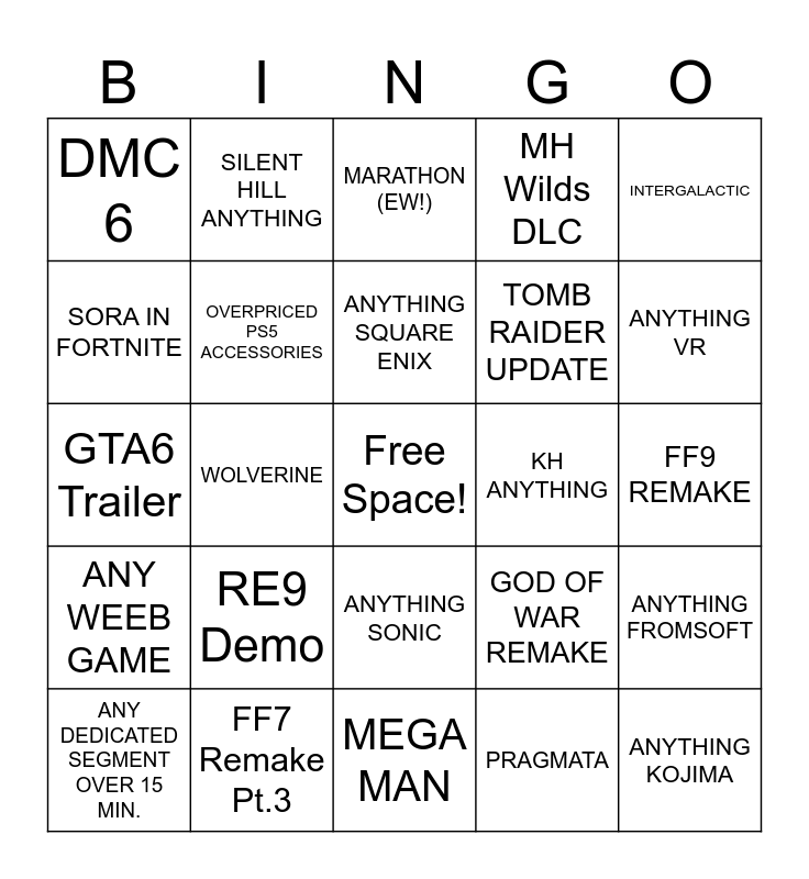 This bingo card has a free space and 24 words: RE9 Demo, FF7 Remake Pt.3, ANYTHING SQUARE ENIX, ANY DEDICATED SEGMENT OVER 15 MIN., INTERGALACTIC, DMC 6, SORA IN FORTNITE, SILENT HILL ANYTHING, KH ANYTHING, ANYTHING SONIC, TOMB RAIDER UPDATE, GTA6 Trailer, GOD OF WAR REMAKE, ANYTHING FROMSOFT, OVERPRICED PS5 ACCESSORIES, PRAGMATA, FF9 REMAKE, MARATHON (EW!), ANYTHING VR, WOLVERINE, ANYTHING KOJIMA, ANY WEEB GAME, MH Wilds DLC and MEGA MAN.