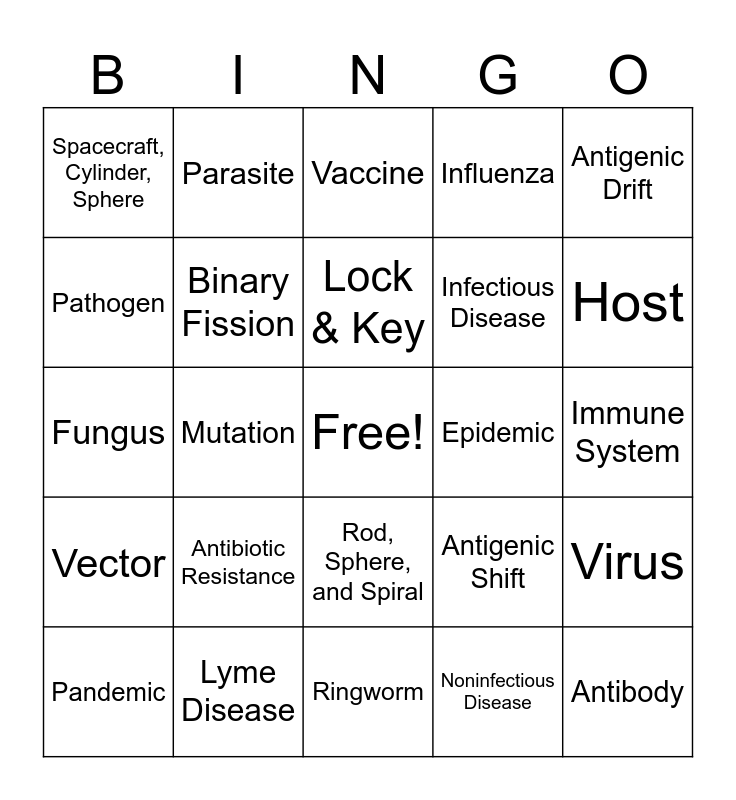 This bingo card has a free space and 28 words: Virus, Bacteria, Infectious Disease, Noninfectious Disease, Pathogen, Vaccine, Parasite, Vector, Epidemic, Pandemic, Fungus, Influenza, Lyme Disease, Ringworm, Host, Antibiotics, Antibiotic Resistance, Binary Fission, Lock & Key, Rod, Sphere, and Spiral, Spacecraft, Cylinder, Sphere, Genome, Antibody, Mutation, Immune System, Antigenic Shift, Antigenic Drift and Mosquito.