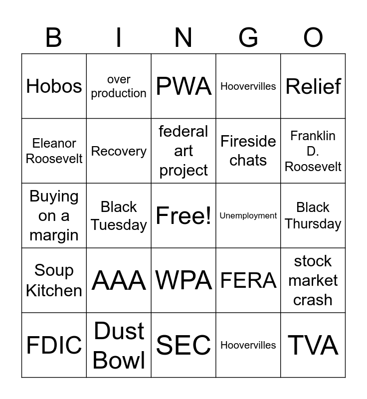 This bingo card has a free space and 29 words: FDIC, Bank Run, Black Tuesday, Reform, Hobos, PWA, Recovery, AAA, Unemployment, Dust Bowl, Black Thursday, TVA, SEC, Hoovervilles, Franklin D. Roosevelt, CCC, WPA, Soup Kitchen, Relief, Buying on a margin, FERA, Herbert Hoover, Fireside chats, Eleanor Roosevelt, Hoovervilles, over production, stock market crash, federal art project and migration.