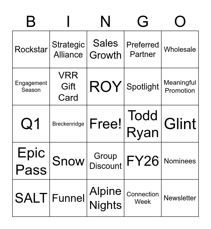 This bingo card has a free space and 24 words: Snow, Funnel, ROY, SALT, Wholesale, Rockstar, Engagement Season, Strategic Alliance, Todd Ryan, Group Discount, Spotlight, Q1, FY26, Nominees, VRR Gift Card, Connection Week, Glint, Sales Growth, Meaningful Promotion, Breckenridge, Newsletter, Epic Pass, Preferred Partner and Alpine Nights.