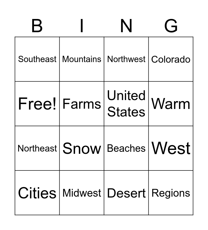 This bingo card has 16 words: Midwest, West, Northwest, Southeast, Northeast, Mountains, Beaches, Desert, Free!, Farms, Cities, Colorado, Snow, Warm, United States and Regions.