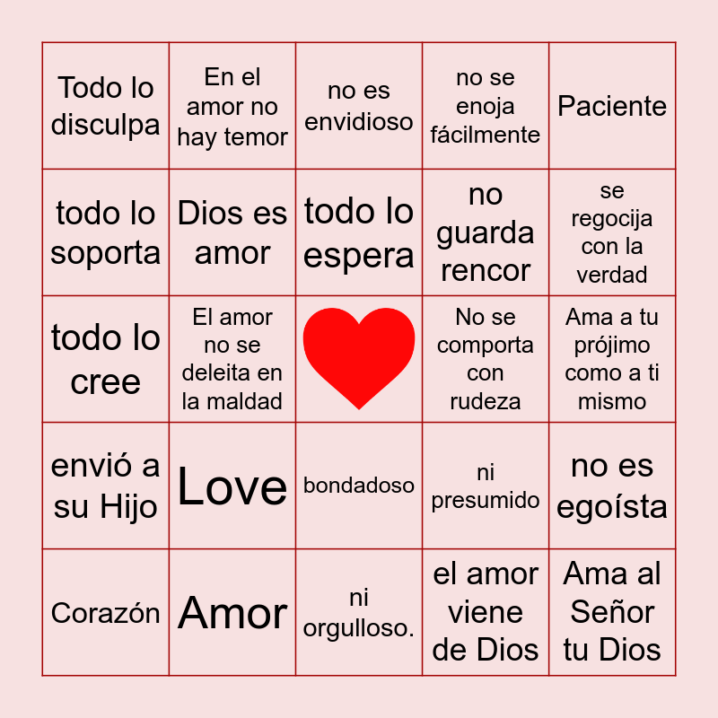 This bingo card has a free space and 24 words: Love, Amor, todo lo espera, Corazón, Paciente, Todo lo disculpa, todo lo soporta, En el amor no hay temor, No se comporta con rudeza, bondadoso, no guarda rencor, todo lo cree, ni presumido, no es egoísta, Dios es amor, el amor viene de Dios, Ama a tu prójimo como a ti mismo, no es envidioso, se regocija con la verdad, El amor no se deleita en la maldad, Ama al Señor tu Dios, envió a su Hijo, no se enoja fácilmente and ni orgulloso..