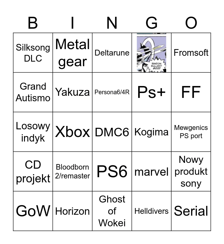This bingo card has 1 images, a free space and 23 words: Bloodborn 2/remaster, Horizon, Persona6/4R, GoW, Fromsoft, Silksong DLC, Grand Autismo, Metal gear, Kogima, PS6, Ps+, Losowy indyk, marvel, Nowy produkt sony, Yakuza, Helldivers, Mewgenics PS port, Deltarune, FF, Xbox, Serial, CD projekt and Ghost of Wokei.