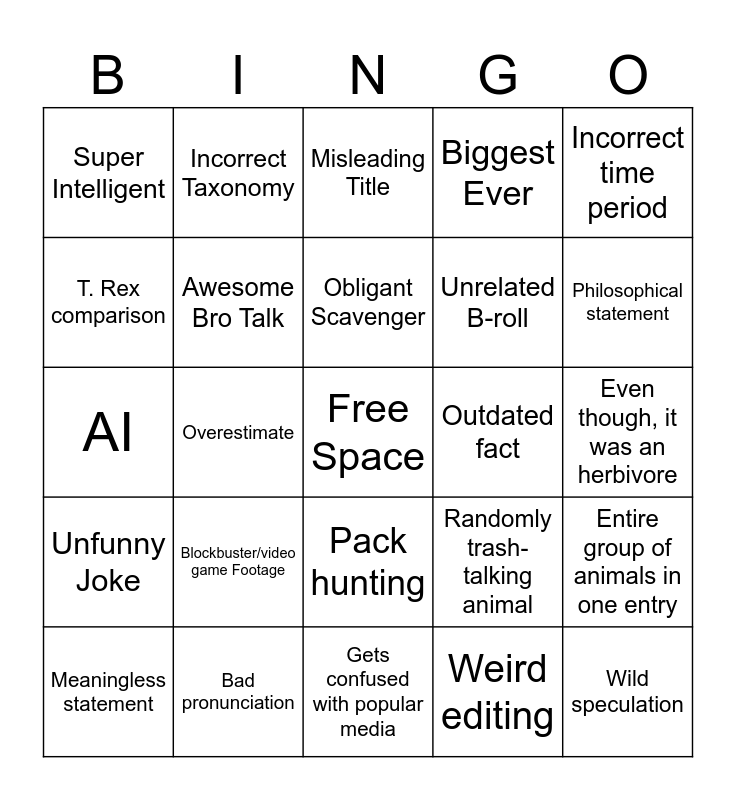 This bingo card has a free space and 24 words: Blockbuster/video game Footage, Bad pronunciation, Obligant Scavenger, Meaningless statement, Incorrect time period, Super Intelligent, T. Rex comparison, Incorrect Taxonomy, Outdated fact, Pack hunting, Unrelated B-roll, AI, Randomly trash-talking animal, Entire group of animals in one entry, Awesome Bro Talk, Weird editing, Even though, it was an herbivore, Misleading Title, Philosophical statement, Overestimate, Wild speculation, Unfunny Joke, Biggest Ever and Gets confused with popular media.
