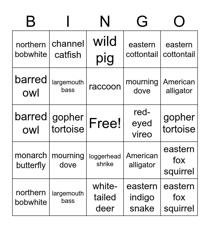 This bingo card has a free space and 32 words: eastern indigo snake, wood duck, gopher tortoise, coyote, monarch butterfly, largemouth bass, eastern cottontail, eastern fox squirrel, channel catfish, white-tailed deer, raccoon, wild pig, red-cockaded woodpecker, protonotary warbler, red-eyed vireo, wild turkey, northern bobwhite, barred owl, loggerhead shrike, mourning dove, American alligator, American bumble bee, gopher tortoise, largemouth bass, eastern fox squirrel, eastern cottontail, mourning dove, barred owl, northern bobwhite, white-tailed deer, American bumble bee and American alligator.