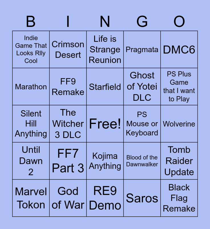 This bingo card has a free space and 24 words: FF7 Part 3, God of War, Starfield, Marvel Tokon, DMC6, Indie Game That Looks Rlly Cool, Marathon, Crimson Desert, PS Mouse or Keyboard, Kojima Anything, Ghost of Yotei DLC, Silent Hill Anything, Blood of the Dawnwalker, Tomb Raider Update, FF9 Remake, Saros, Wolverine, Life is Strange Reunion, PS Plus Game that I want to Play, The Witcher 3 DLC, Black Flag Remake, Until Dawn 2, Pragmata and RE9 Demo.