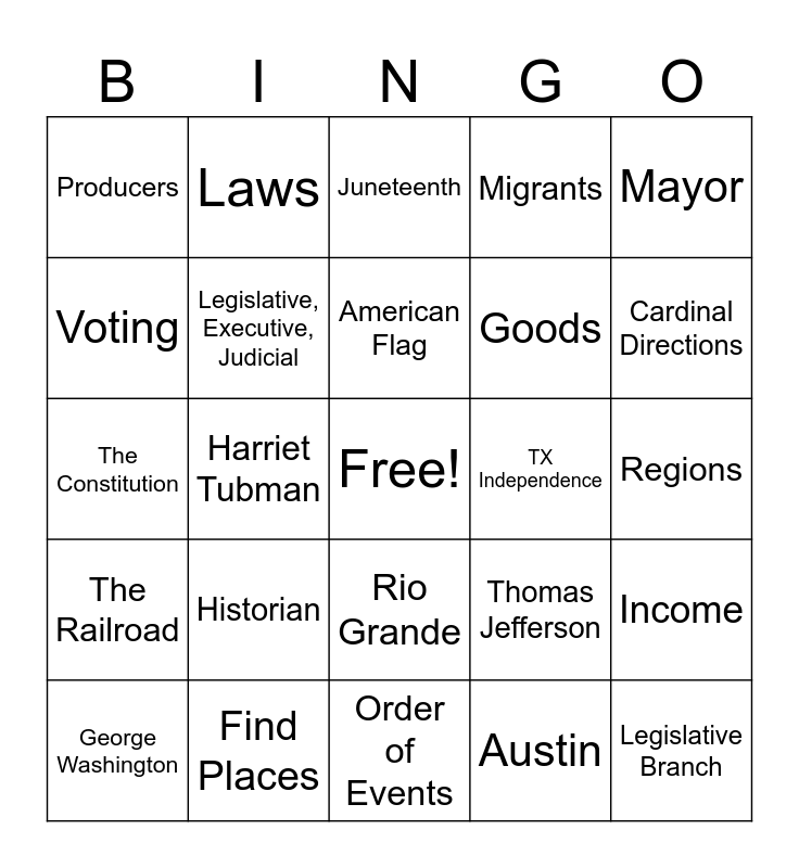 This bingo card has a free space and 24 words: Historian, Find Places, American Flag, George Washington, Mayor, Producers, Voting, Laws, TX Independence, Rio Grande, Goods, The Constitution, Thomas Jefferson, Income, Legislative, Executive, Judicial, Austin, Regions, Juneteenth, Cardinal Directions, Harriet Tubman, Legislative Branch, The Railroad, Migrants and Order of Events.