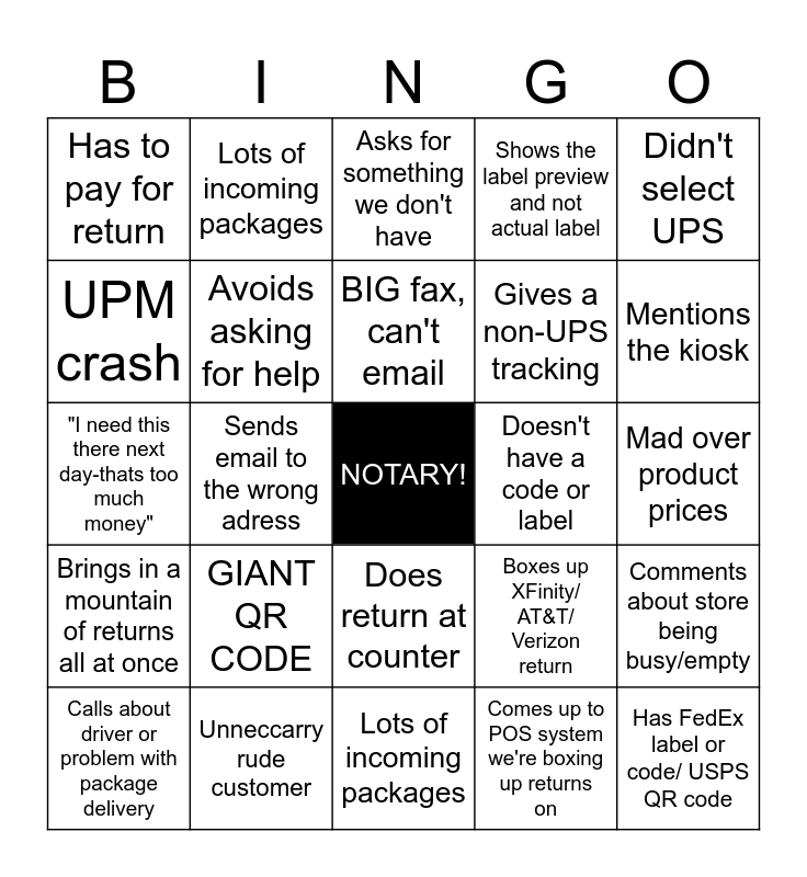 This bingo card has a free space and 24 words: GIANT QR CODE, Unneccarry rude customer, BIG fax, can't email, Calls about driver or problem with package delivery, Didn't select UPS, Has to pay for return, UPM crash, Lots of incoming packages, Doesn't have a code or label, Does return at counter, Gives a non-UPS tracking, "I need this there next day-thats too much money", Boxes up XFinity/ AT&T/ Verizon return, Comments about store being busy/empty, Avoids asking for help, Comes up to POS system we're boxing up returns on, Mad over product prices, Asks for something we don't have, Mentions the kiosk, Sends email to the wrong adress, Has FedEx label or code/ USPS QR code, Brings in a mountain of returns all at once, Shows the label preview and not actual label and Lots of incoming packages.