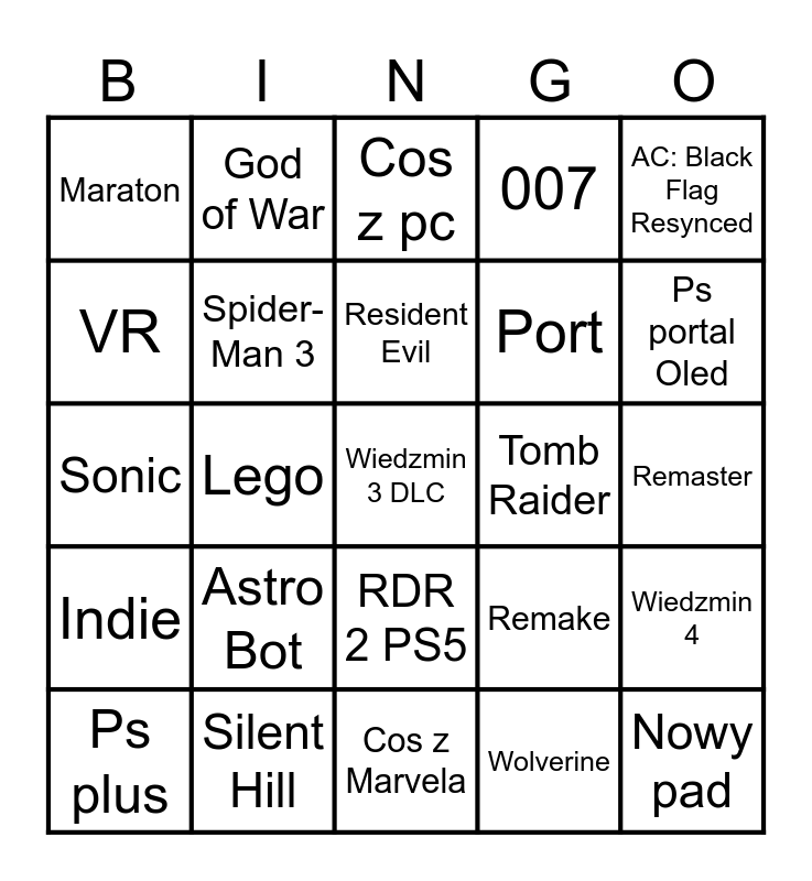 This bingo card has a free space and 26 words: RDR 2 PS5, Wolverine, Resident Evil, Silent Hill, AC: Black Flag Resynced, Maraton, VR, God of War, Remaster, Remake, Port, Sonic, Wiedzmin 4, Ps plus, Lego, Japonska gra, 007, Indie, Cos z pc, Nowy pad, Ps portal Oled, Cos z Marvela, Tomb Raider, Astro Bot, Spider-Man 3 and GTA IV Port.