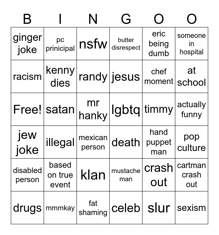 This bingo card has 36 words: mustache man, klan, celeb, racism, jew joke, lgbtq, kenny dies, fat shaming, eric being dumb, crash out, at school, butter disrespect, cartman crash out, satan, jesus, ginger joke, disabled person, timmy, Free!, nsfw, mr hanky, illegal, death, mexican person, hand puppet man, pc prinicipal, chef moment, mmmkay, randy, someone in hospital, sexism, drugs, pop culture, actually funny, based on true event and slur.