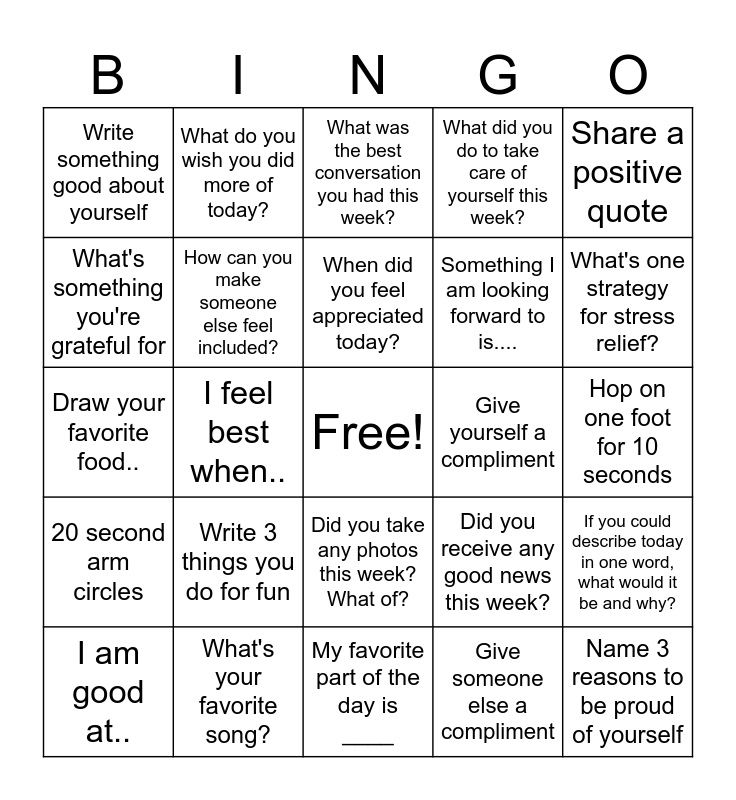 This bingo card has a free space and 29 words: I am good at.., Write about a happy event in your life., I feel best when.., Do 10 jumping jacks, Write something good about yourself, What was the best conversation you had this week?, How can you make someone else feel included?, Write 3 things you do for fun, Give yourself a compliment, What's your favorite song?, Hop on one foot for 10 seconds, Name 3 reasons to be proud of yourself, My favorite part of the day is ____, Give someone else a compliment, What's one strategy for stress relief?, Who is someone important to you and why?, Did you take any photos this week? What of?, 20 second arm circles, Share a positive quote, Draw your favorite food.., Did you receive any good news this week?, What made you laugh this week?, Something I am looking forward to is...., What's something you're grateful for, What did you do to take care of yourself this week?, What do you wish you did more of today?, If you could describe today in one word, what would it be and why?, When did you feel appreciated today? and Did anything surprise you today?.