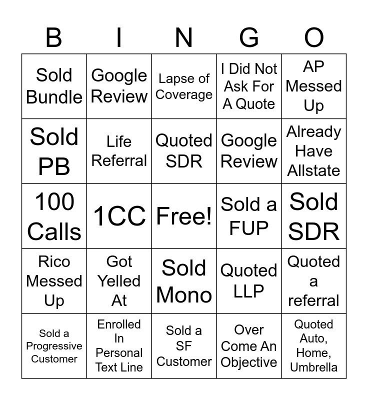This bingo card has a free space and 24 words: Got Yelled At, Enrolled In Personal Text Line, Quoted SDR, Sold a Progressive Customer, AP Messed Up, Sold Bundle, Sold PB, Google Review, Sold a FUP, Sold Mono, Google Review, 100 Calls, Quoted LLP, Quoted a referral, Life Referral, Over Come An Objective, Sold SDR, Lapse of Coverage, Already Have Allstate, 1CC, Quoted Auto, Home, Umbrella, Rico Messed Up, I Did Not Ask For A Quote and Sold a SF Customer.