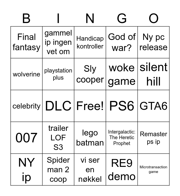 This bingo card has a free space and 24 words: trailer LOF S3, Spider man 2 coop, Sly cooper, NY ip, Ny pc release, Final fantasy, wolverine, gammel ip ingen vet om, PS6, lego batman, woke game, celebrity, Intergalactic: The Heretic Prophet, Remaster ps ip, playstation plus, RE9 demo, GTA6, Handicap kontroller, silent hill, DLC, Microtransaction game, 007, God of war? and vi ser en nøkkel.