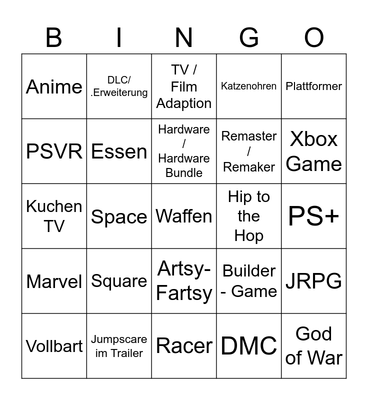This bingo card has a free space and 24 words: Square, Jumpscare im Trailer, Hardware / Hardware Bundle, Vollbart, Plattformer, Anime, PSVR, DLC/ .Erweiterung, Hip to the Hop, Artsy-Fartsy, Remaster / Remaker, Kuchen TV, Builder - Game, JRPG, Essen, DMC, PS+, TV / Film Adaption, Xbox Game, Space, God of War, Marvel, Katzenohren and Racer.