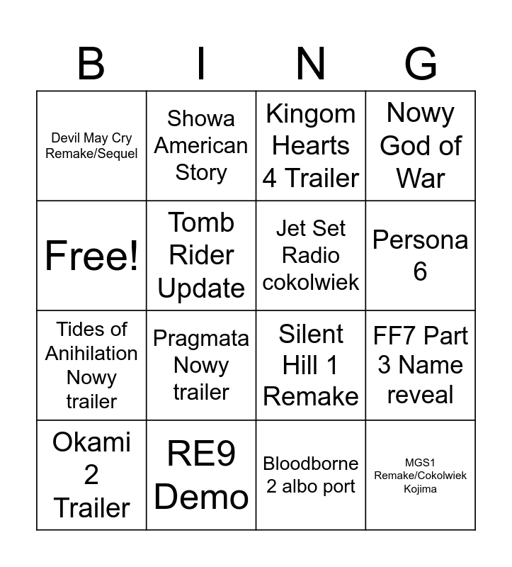 This bingo card has 16 words: RE9 Demo, FF7 Part 3 Name reveal, Kingom Hearts 4 Trailer, Devil May Cry Remake/Sequel, Tides of Anihilation Nowy trailer, Showa American Story, Silent Hill 1 Remake, Bloodborne 2 albo port, Free!, Tomb Rider Update, Okami 2 Trailer, Nowy God of War, Pragmata Nowy trailer, Persona 6, Jet Set Radio cokolwiek and MGS1 Remake/Cokolwiek Kojima.