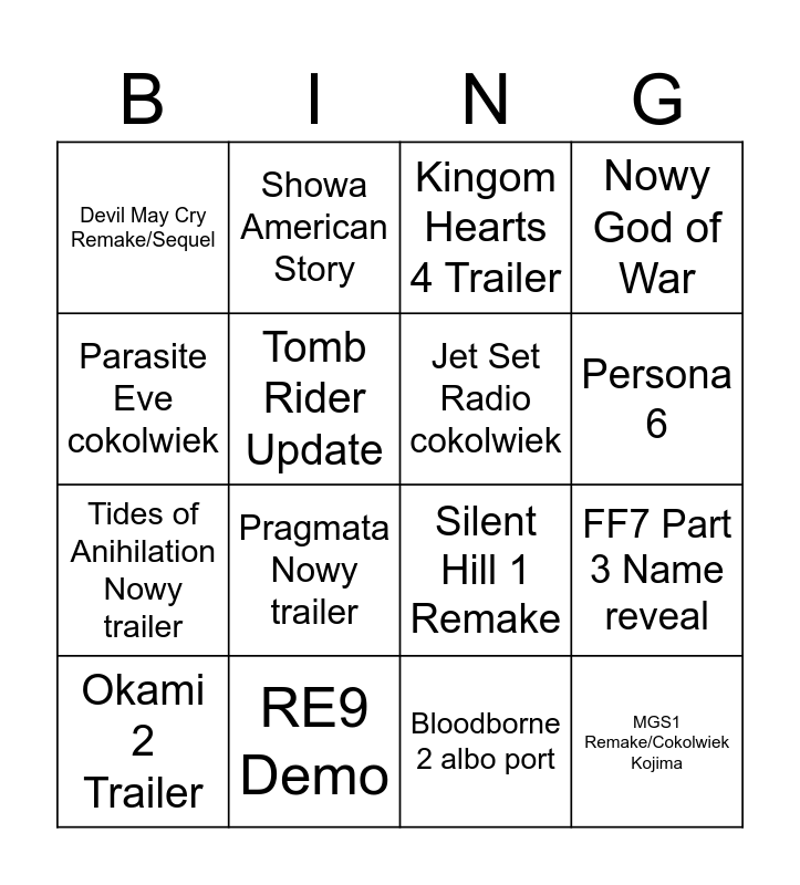 This bingo card has 16 words: RE9 Demo, FF7 Part 3 Name reveal, Kingom Hearts 4 Trailer, Devil May Cry Remake/Sequel, Tides of Anihilation Nowy trailer, Showa American Story, Silent Hill 1 Remake, Bloodborne 2 albo port, Parasite Eve cokolwiek, Tomb Rider Update, Okami 2 Trailer, Nowy God of War, Pragmata Nowy trailer, Persona 6, Jet Set Radio cokolwiek and MGS1 Remake/Cokolwiek Kojima.