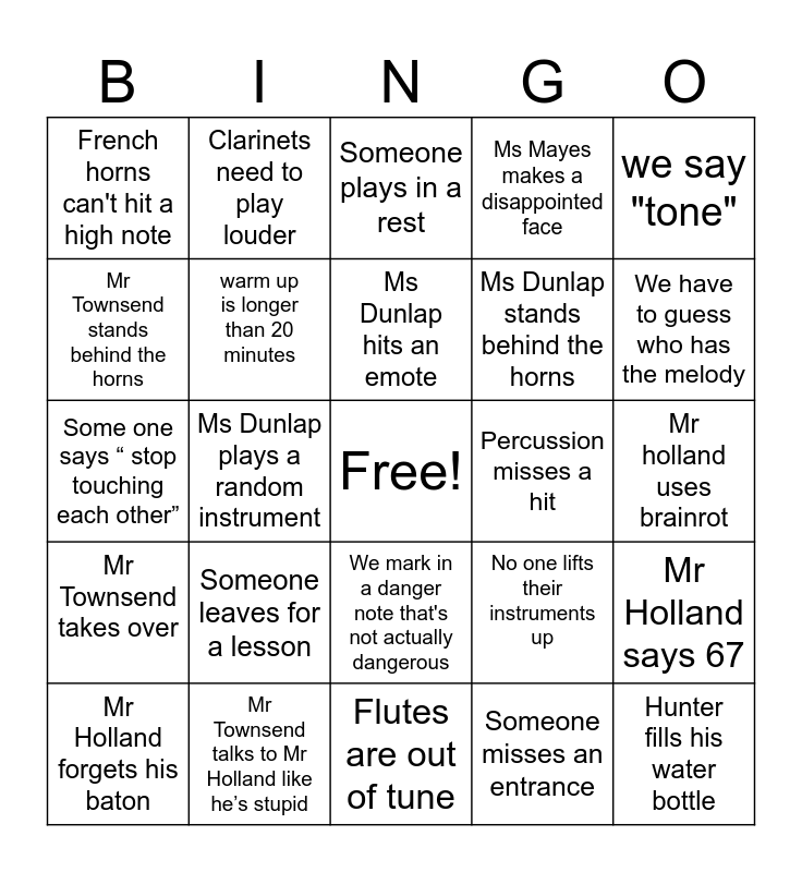 This bingo card has a free space and 36 words: “We will work on it in sectionals”, Tells a section to play louder, A trumpet complains, warm up is longer than 20 minutes, No one lifts their instruments up, Mr Townsend takes over, Ms Dunlap hits an emote, Mr Holland makes a bad joke, we say "tone", "someone tell me what we talked about in sectionals today", Ms Dunlap plays a random instrument, Ms Mayes makes a disappointed face, A euphonium gets a talking to, Percussion misses a hit, We have to guess who has the melody, French horns can't hit a high note, Mr Townsend corrects a saxophone, Someone leaves for a lesson, Hunter fills his water bottle, Someone plays in a rest, Mr holland uses brainrot, Mr Holland says 67, Mr Townsend talks to Mr Holland like he’s stupid, Mr Holland forgets his baton, Flutes are out of tune, Clarinets need to play louder, Some one says “ stop touching each other”, Trombones don't know something, Ms Dunlap stands behind the horns, Mr Townsend stands behind the horns, Someone needs a pencil, We count a rhythm, Someone misses an entrance, We mark in a danger note that's not actually dangerous, Up beats are out of time and Someone plays early.